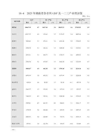 16-4 2023 年湖南省各市州 GDP 及一二三产业增加值