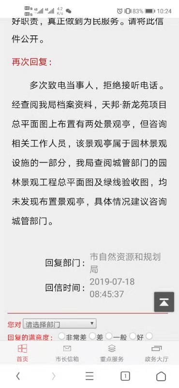 方郑先生: 您好!您的来信《天龙新龙苑园林亭子问题》收悉。现将有关情况说明如下: 一、项目基本情况 经工作人员核实,“天邦新龙苑”由岳阳市天邦房地产开发有限公司开发建设。该项目净用地面积为24227.4平方米,该项目标准绿地率为35%,标准绿地面积为8479.59平方米。项目于2017年3月在原岳阳市风景园林局办理绿线划定手续。项目于2019年5月在我局办理了绿线验收手续,绿线验收绿地率为38.51%,验收绿地面积为9330.48平方米,绿线验收指标满足规范要求。 二、景亭相关情况 项目附属绿化工程建设时在不违反规范强制标准的情况下可以进行优化调整,您反映的小区园林景亭问题不属于规范强制标准范畴,开发商可自行优化调整。 感谢您对我局园林绿化工作的关心和监督,欢迎多提宝贵意见! 岳阳市城市管理和综合执法局 2019年8月15日 |