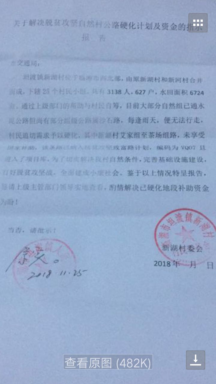 定湖镇新湖村艾家组至茶场组的扶贫致富路计划,项目编码vq07, 村里先是说国家拨了修路的款,但是钱不够修到村民家门口,让我们村民自费筹钱,于是家家户户都上交了钱。现在11月底开始修路了,工程却外包给私人,施工对私改线路,不修到我们村民门口。我们不解,为什么修路我们村民已经自己掏钱了,国家也拨款了,为何路只修一半,剩下的村路,我们要再重复这么多年的泥泞路吗?什么时候可以真的乡村都通公路?修路的钱都到哪里去了?希望政府部门能调查清楚后给村民一个公开的说法。国家的扶贫修路政策,是否真的贯彻实施了。急盼回复的村民。 附件1:WechatIMG3.jpeg |