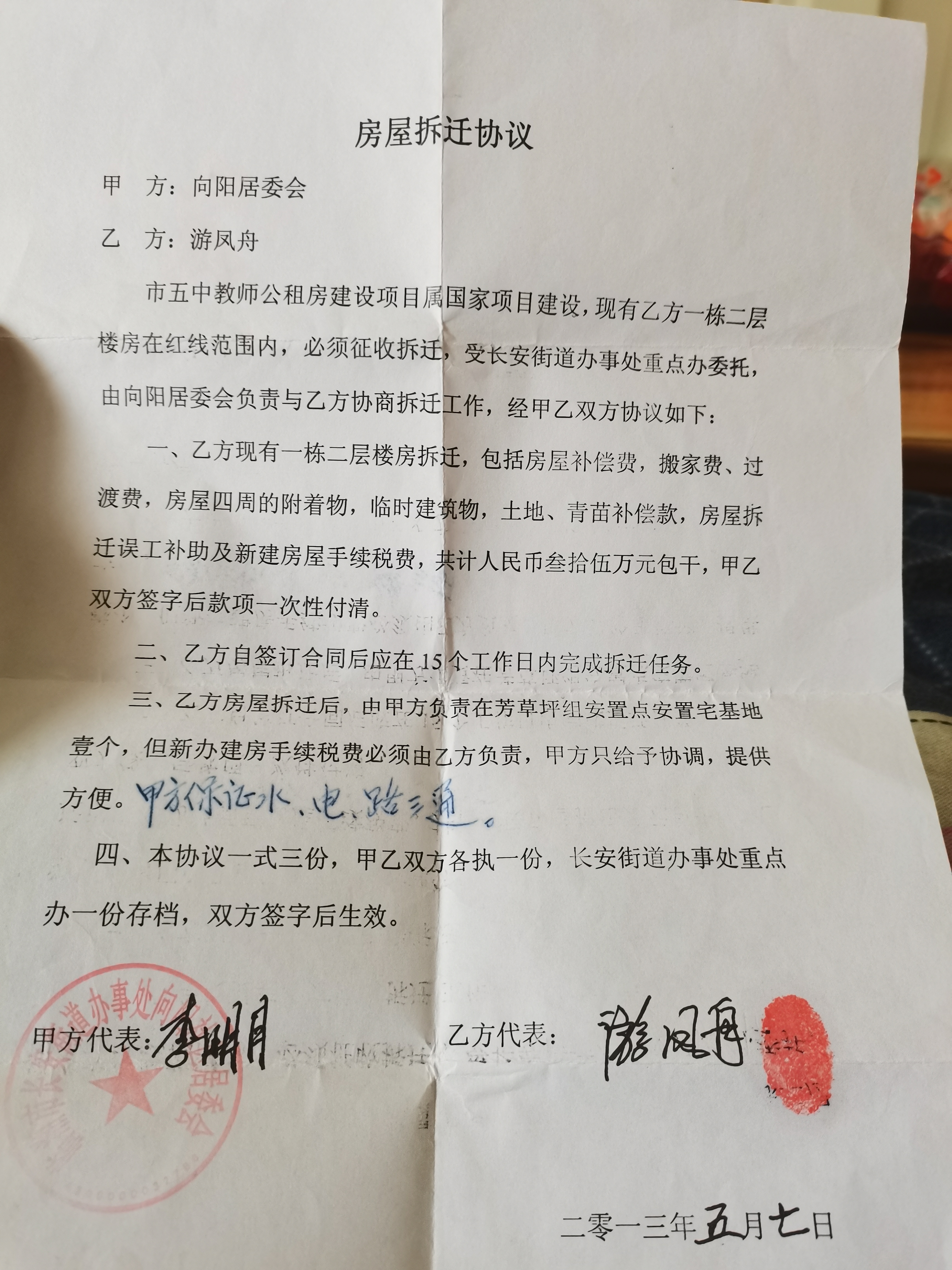 尊敬的市长您好,我叫游凤舟,家住五里牌街道向阳路牛奶冲。2013年因一中扩大征收,当时只有我一栋房屋拆迁,经长安街道办事处协调补偿34万,负责我的宅基地,办完所有手续自费1万,经街道办事处决定,我新屋做在向阳社区芳草坪组安置区,并规划成图,当时与长安街道办事处相关负责人达成协议,保证水电路三通。由于这个新的宅基地原来是一个小型水库,为修建新屋,我们花了大笔资金打桩,导致建房款严重超标,花费近80万,背上了一大笔债务。因政府规划取消安置区,仅我一户建好房屋后不允许再建,当时有一条土公路,其后为修建芙蓉中路,抬高路面,而废止旧公路,后经向阳居委会决定新修一条公路至芙蓉中路,结果居委会说征收未协调好,后因隔壁建房,打通私人关系,临时借道,一晃6年过去。2020年底,因为政府不允许隔壁建房,借道被终止,道路被种上树苗,不再通行。我们一直在向阳居委会协调,屡屡没有结果,我们的困难一再被搁置。
