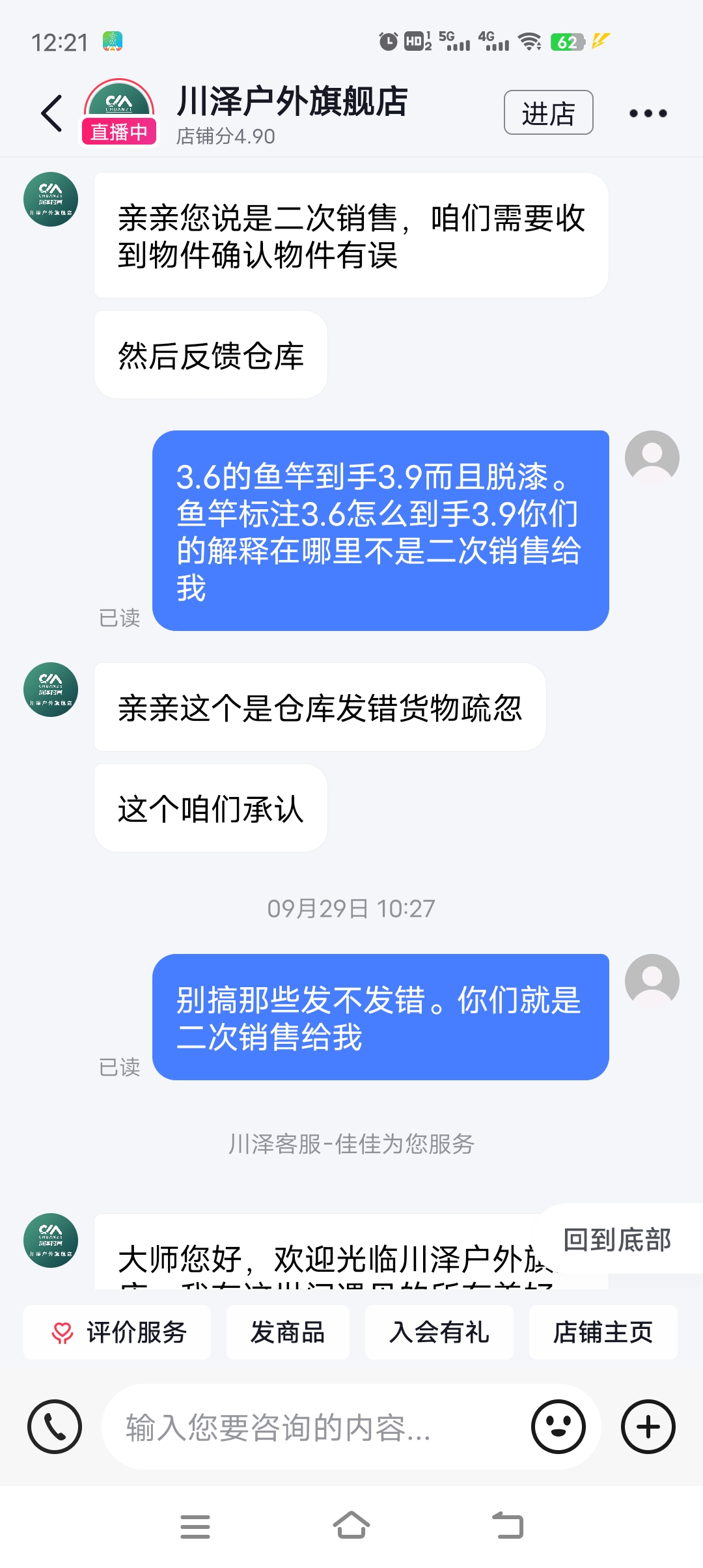 1.您于9月25日在其公司抖音平台旗舰店购买“川云锏综合3.6米鱼竿一支”,9月29日您联系该公司反馈实际收货为3.9米鱼竿,质疑为配节鱼竿,该公司客服第一时间对您进行回复,同意寄回商品进行更换,由于您个人强烈要求该公司先补发再退货,经双方多次沟通,10月3日,该公司在没有收到退货基础上,已为您补发3.6米鱼竿一支。