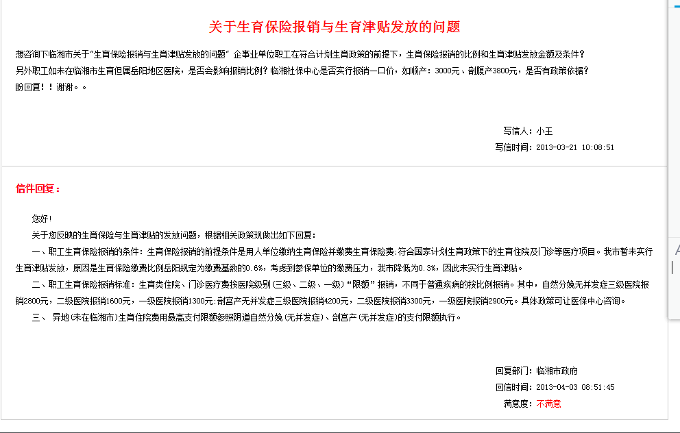 | 回复内容: | 呵呵: 你好!你的来信我们已经收悉。 根据你来信的内容,我们进行了调查核实,现答复如下: 一、生育住院报销实行分级限额报销。参保职工如未在临湘市生育但属岳阳地区医院不会影响报销标准。根据《关于调整基本医疗生育保险有关待遇的通知》(临人社发〔2012〕12号)文件精神,生育住院报销的具体标准为:自然分娩无并发症的一级医院报销1300元,二级医院报销1600元,剖宫产无并发症的一级医院报销2900元,二级医院报销3300元,阴道分娩并产后出血(输血2个)一级医院报销2300元,二级医院报销2800元,剖宫产并产后出血一级医院报销3600元,二级医院报销4200元,围产期严重并发症(妊28周-产后4周)一级医院报销4400元,二级医院报销5200元。 二、根据《关于印发岳阳市生育保险和职工基本医疗保险合并实施试点方案的通知》(岳政办发〔2017〕13号)文件精神,临湘市生育保险保险与职工医保基金账户于2017年7月1日完成合并,生育待遇支出由职工医保统筹基金支付,如上级部门出台生育待遇新政策将按新政策执行。 2017年10月23日 |