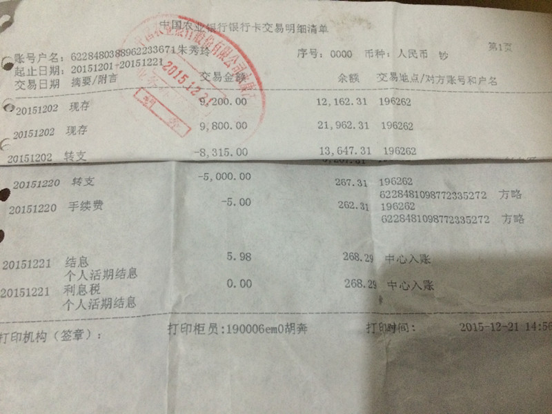 初次见面,我是浙江省缙云县人朱秀玲,联系电话18358955513,现居住浙江省金华市永康市古山镇四村工业区下谢山39号,在永康打工。2015年12月20日15点37分,我在永康古山的“中国农业银行”打款,本想将5000块钱汇给一个朋友,因银行的ATM机功能有误,误将5000块钱打到了另一个账号(62284810987723****2,中国农业银行,方略)(我自己账号:62284803889622****1,中国农业银行,朱秀玲),经与农业银行协商,银行只肯给个电话,而方略联系电话是空号。经过我自己多方联系,最终了解到误打款对方名叫“方略”,身份证号码是43062619****94215,家庭地址是湖南省平江县木金乡保全村7号,现无法联系到方略本人,所以请市长大人帮帮忙,联系到方略本人或者家里人,要回我自己两个月的血汗钱。