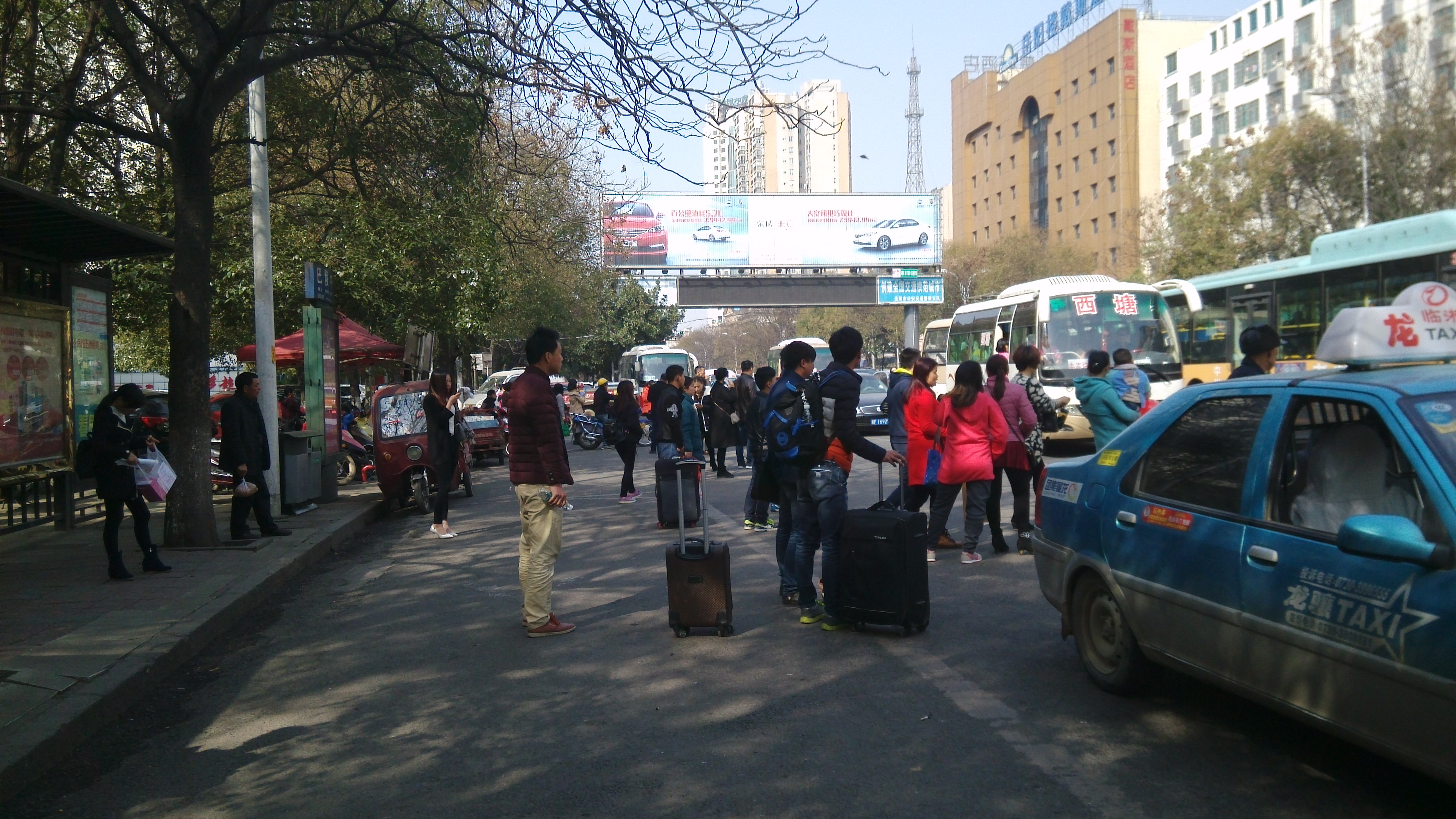 这是我出行时在公交站台拍摄到的出租车与公交抢站台的情况,出租车占据了公交站台前差不多路面一半的地方,当时我建议出租车再往前或后退一些,司机根本不理,后来又来了一辆出租,紧跟着停到几乎路中间,乘客无奈只好站到路中央候车,后来乘上公交我才发现前面有出租车招呼站,但几乎要走一站路的距离!再往前就没有看到招呼站了!这样设置不合理、不方便所以才造成出租与公交抢站台的局面。