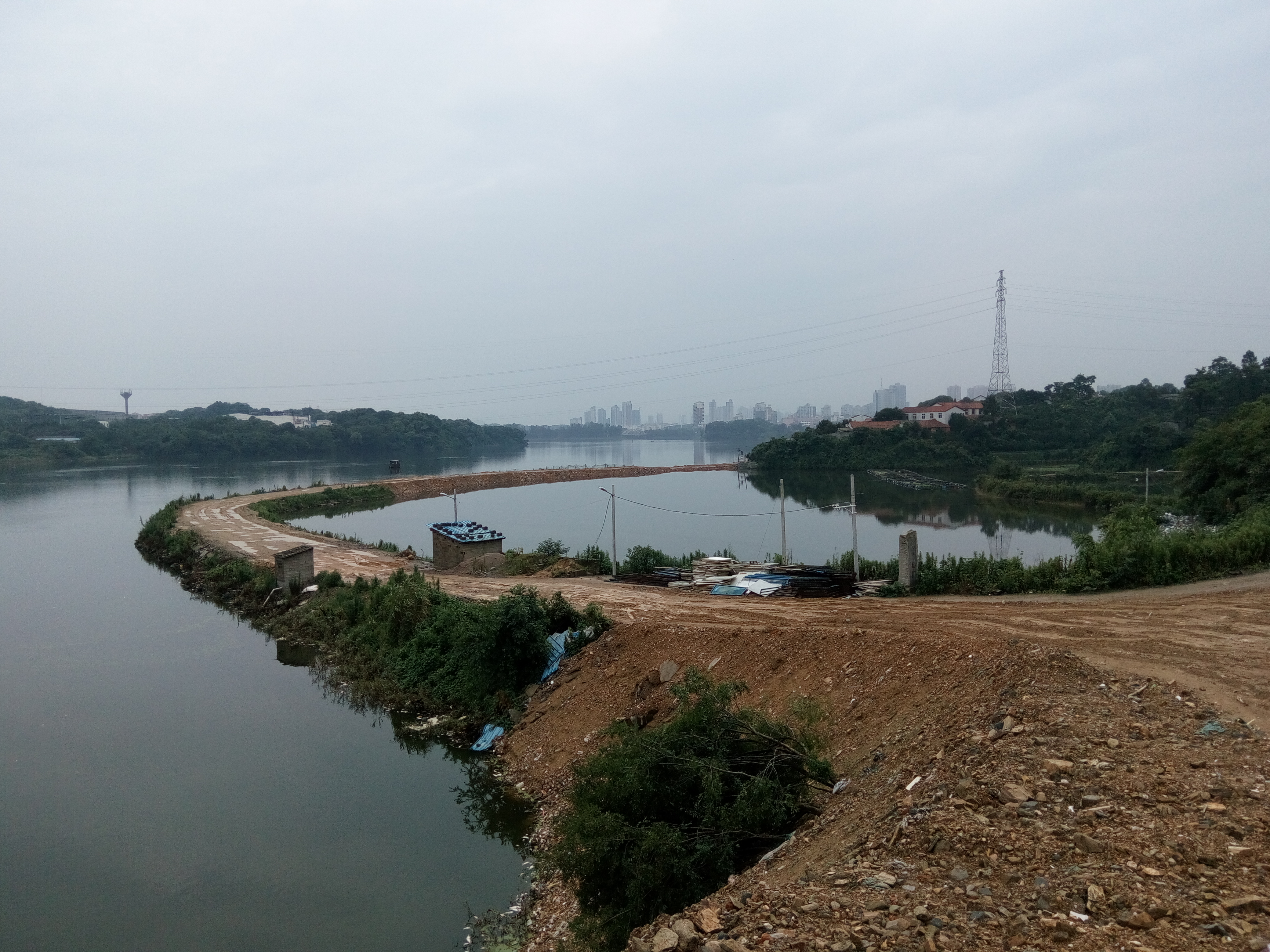 最近,珍珠山以南、北港河北岸的游路路基正在由东向西填土,其中,有段大概300多米长的路段是在原有一条老路的基础上填充的,这条老路弧形状,破水而走,两端连接岸边,把本不宽的河面切割成两块,破坏了那里的湖光水色,再者,游路北边切割出来的一块不大不小的水面因与大湖隔开,势必会成为死水,不能独立成景。因此,(一)我们建议,将原有破水而过的那条老路挖去,以增加整体水域水面。(二)新游路基本沿北港河北岸自然行走,并与珍珠山山脚地貌有机衔接。