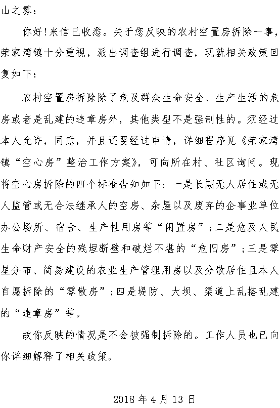 | 再次回复: | 山之雾: 您好!感谢你对我们工作的关注与支持。 2018年4月16日 |