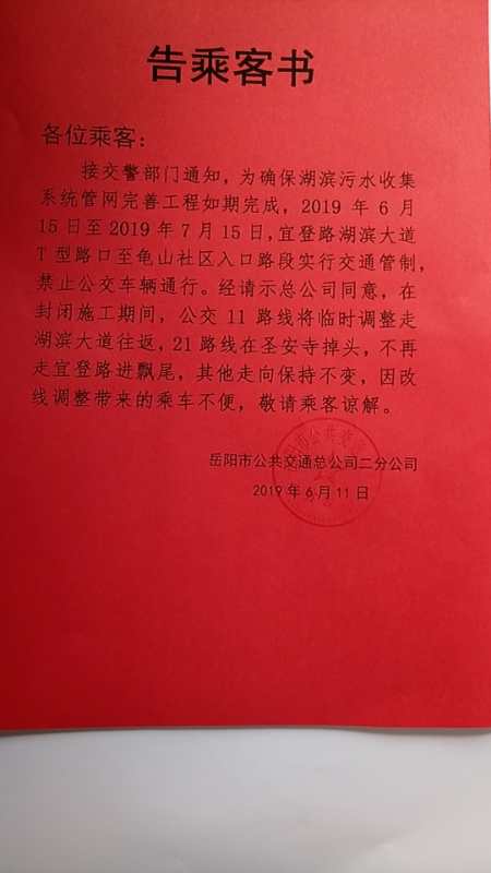 | 回复内容: | 耿治国网友您好: 您所反映的问题已收悉,感谢您对我司的关心与支持。我司接到信访件后非常重视,6月14日上午已由二分公司书记带11路、21路线长与交警和施工方及部分乘客代表现场查看。根据反馈,因宜登路段到时开挖严重,除允许行人、二轮摩托车、二轮电动车利用施工便道通行外,其他车辆一律禁止通行,禁止通行管制时间至7月15日。 特此回复 岳阳市公共交通总公司 2019年6月14日 |