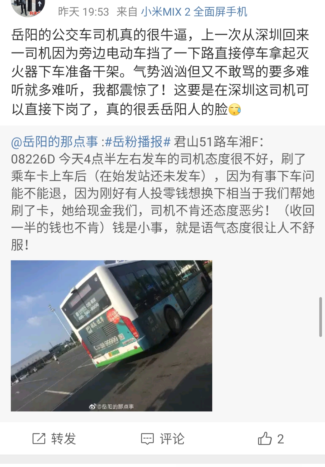 我不坐51路,但是从微博上,新闻上,其他曝光途径我最少看到过四个51路吐糟司机的时间不是,什么不让老人上车,什么违法形式,还有今天服务态度,岳阳这么多线路虽然别的线路也有态度投诉,但也是极少。像51路这种隔断时间看见一次投诉,吐糟的51路第一没人第二,不知道君山公交公司是怎么培养司机素质以及服务态度的问题的。