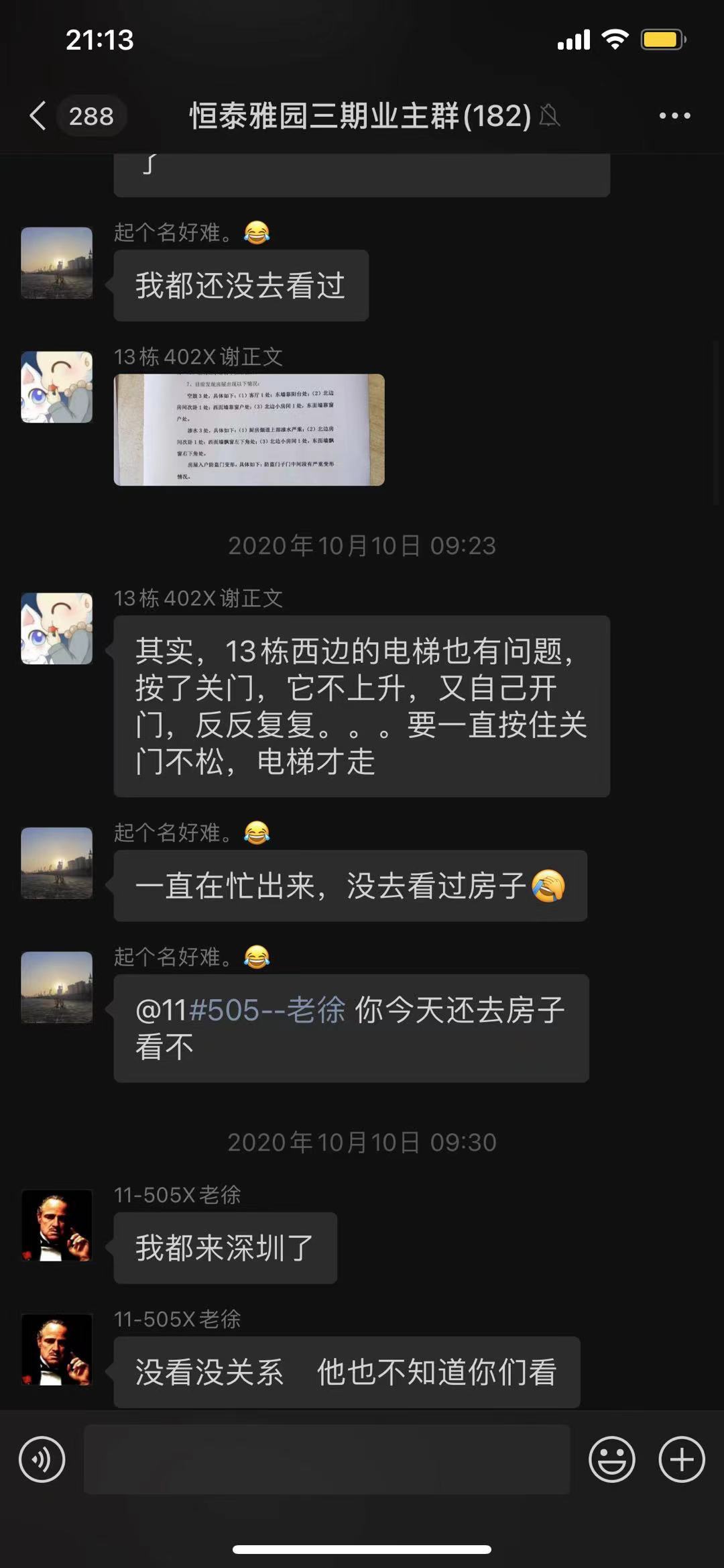 内容: 芭蕉湖恒泰雅园三期电梯,品牌:西继迅达,存在重大安全隐患,请有关部门责令开发商更换!必须是找开发商! 自2020年10月交房以来,电梯频发故障:1)电梯门自动反复开与关,就是不运行;2)频发故障报警,经常性无法正常使用,电梯房都快成楼梯房了;3)关人、锁人之事不绝,严重危害人民群众的生命安全!最近就关了一位女业主,若非救援及时,怕是已经窒息,救出来时,她站都站不稳! 下面以13栋西单元为例,介绍一下近期故障情况(仅个人所知的,实际可能更多): 1、2021年8月27日,电梯关人,被关的是我妈,庆幸未受伤。电梯位置正常,易于救援。 2、2021年9月12日,电梯坏,未关人,影响使用。(见附图1) 3、2021年9月18日,电梯关人,被关的是401女业主,即将窒息,电梯卡在半空,难救援。(见附图2) 其实,早在交房前,13栋西单元电梯就已出现故障(见附图3)。 新楼盘,交房不足一年,电梯存在重大安全隐患,这不是仅靠物业维护,就能解决的事情。 在此提出请求,也是警醒:请有关部门必须尽快责令开发商更换电梯!必须找开发商更换电梯!尤其是13栋西单元电梯!这电梯就是悬在人民群众头上的一把刀,保不准什么时候掉下来。